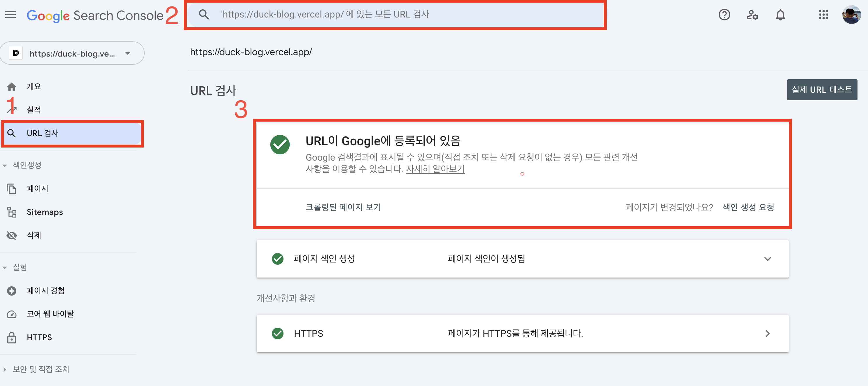 개별 URL을 검색하면 해당 페이지가 어떤 이유로 색인되었는지 확인할 수 있습니다. 색인이 되지 않았다면 색인 요청을 할 수 있습니다. 단, 색인 요청은 수동으로 진행되며 시간이 소요되고, 요청 횟수에 제한이 있으므로 주의해야 합니다.